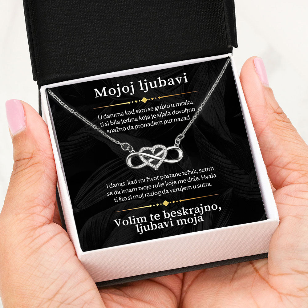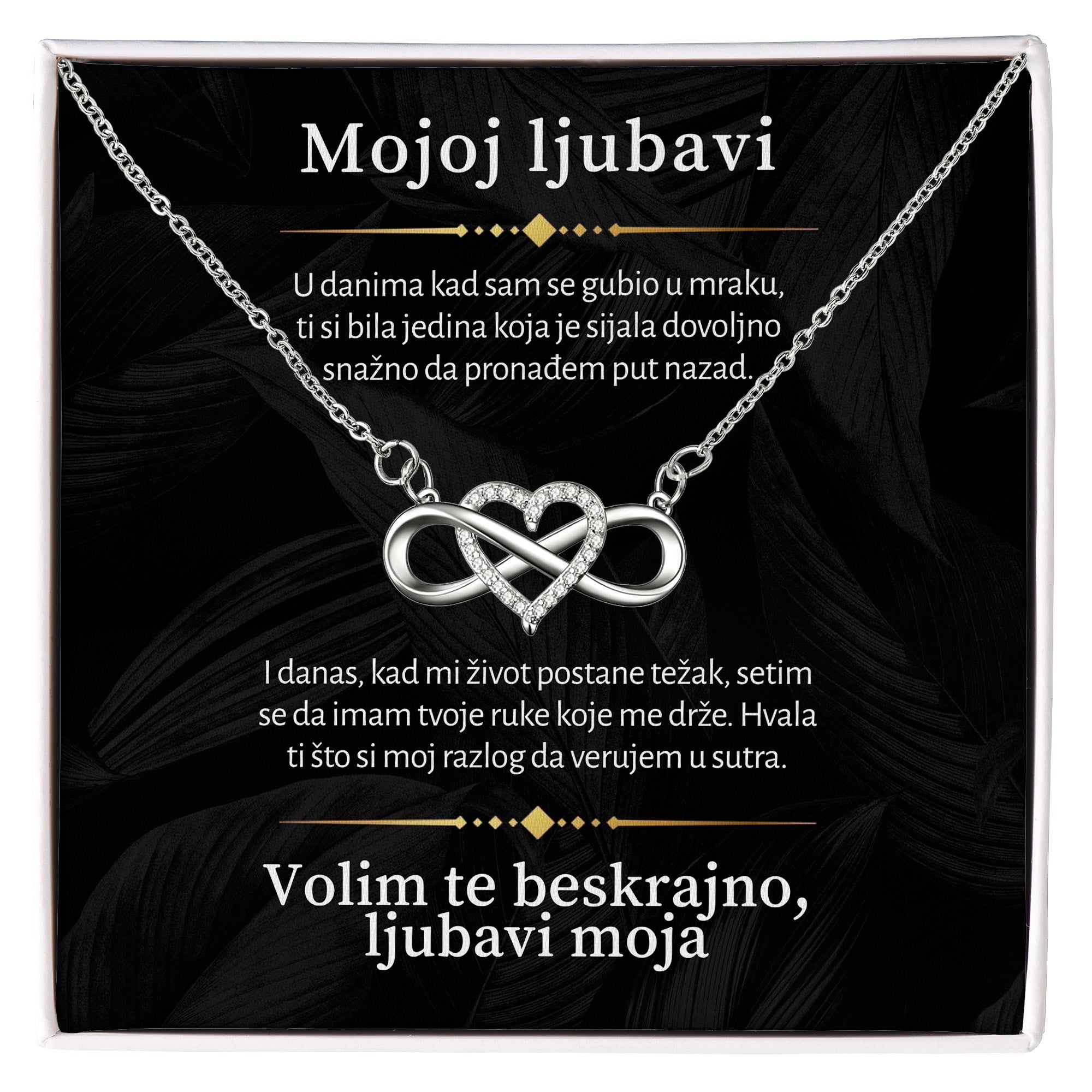 Predivna ogrlica "Infiniti srce" kombinuje simbol beskonačnosti sa oblikom srca, predstavljajući neprekidnu ljubav i povezanost. Ukrašena cirkonskim kristalima i izrađena od visokokvalitetnog nerđajućeg čelika, ovaj komad nakita je savršen za svaku priliku. Ogrlica dolazi u luksuznoj kutiji, uz posebnu posvetu koja dodaje još veću emotivnu vrednost ovom poklonu.
