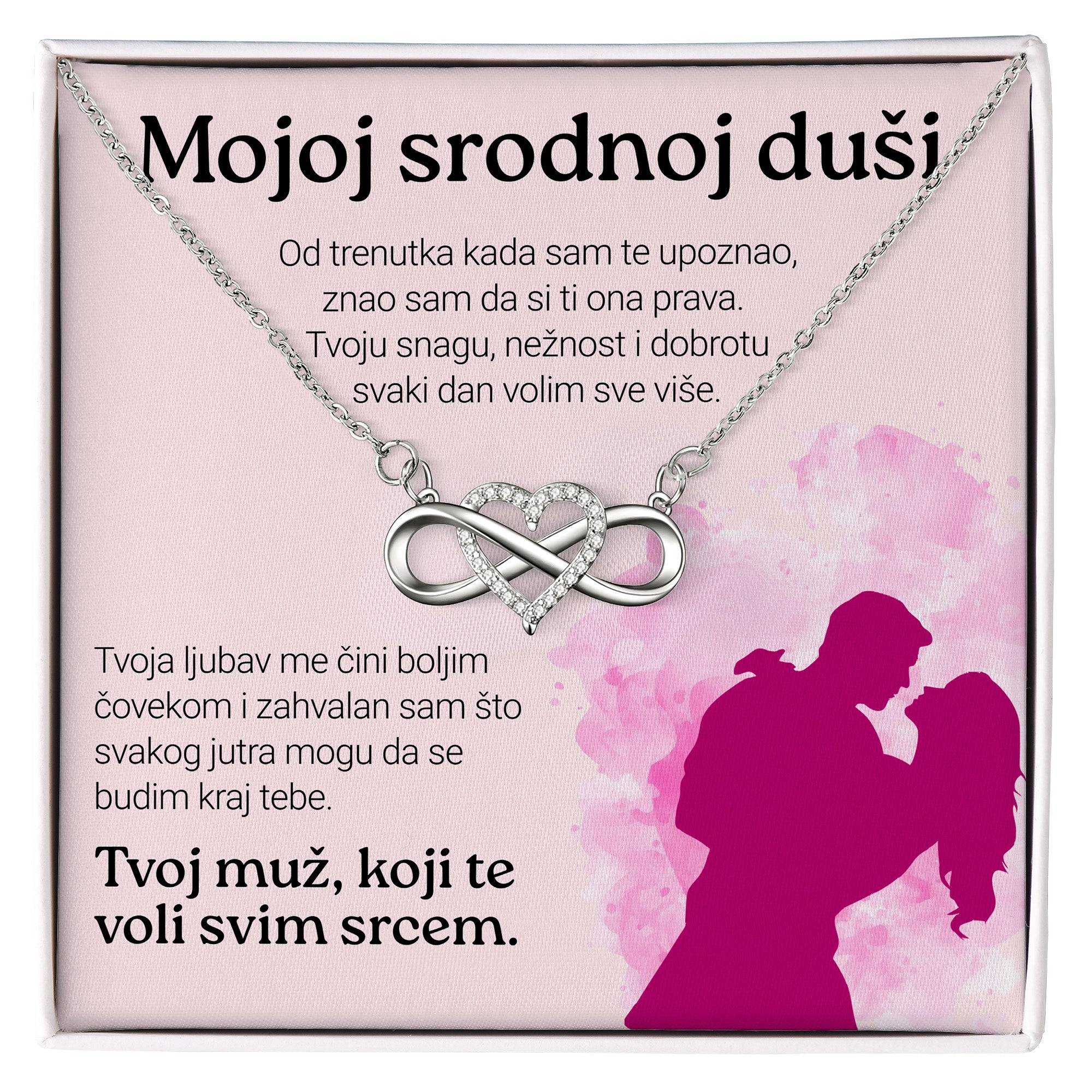 Predivna ogrlica "Infiniti srce" kombinuje simbol beskonačnosti sa oblikom srca, predstavljajući neprekidnu ljubav i povezanost. Ukrašena cirkonskim kristalima i izrađena od visokokvalitetnog nerđajućeg čelika, ovaj komad nakita je savršen za svaku priliku. Ogrlica dolazi u luksuznoj kutiji, uz posebnu posvetu koja dodaje još veću emotivnu vrednost ovom poklonu.
