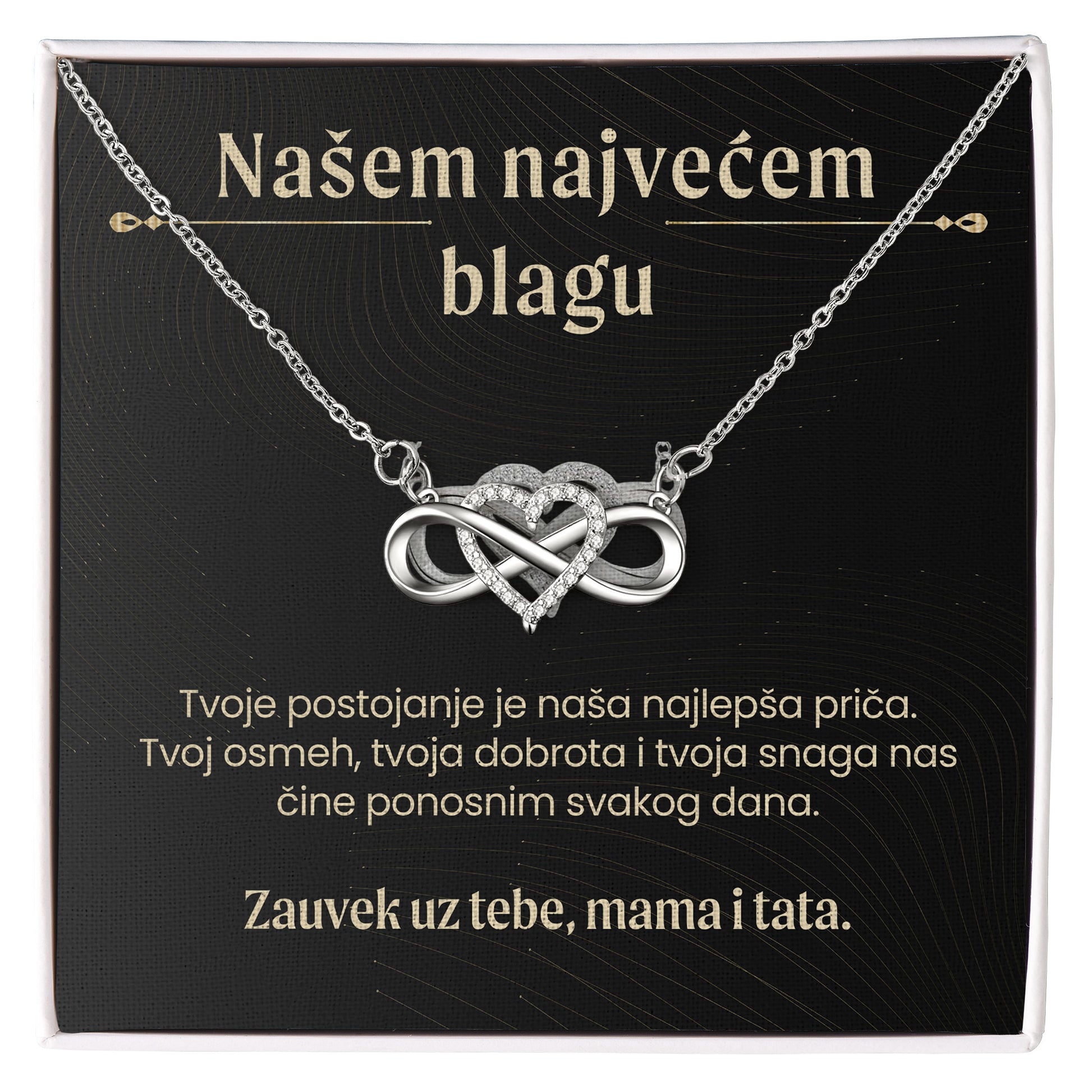 Predivna ogrlica "Infiniti srce" kombinuje simbol beskonačnosti sa oblikom srca, predstavljajući neprekidnu ljubav i povezanost. Ukrašena cirkonskim kristalima i izrađena od visokokvalitetnog nerđajućeg čelika, ovaj komad nakita je savršen za svaku priliku. Ogrlica dolazi u luksuznoj kutiji, uz posebnu posvetu koja dodaje još veću emotivnu vrednost ovom poklonu.