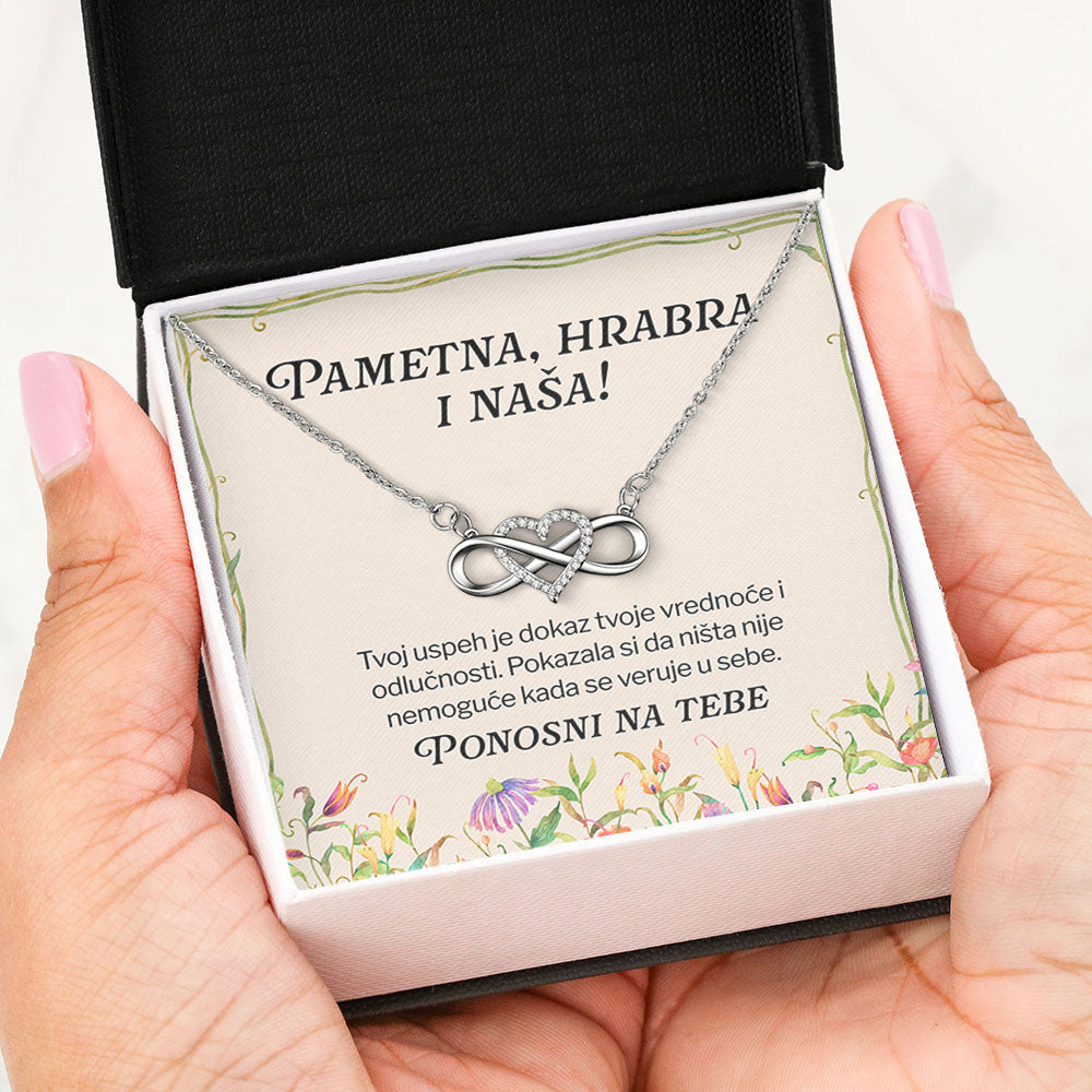 Predivna ogrlica "Infiniti srce" kombinuje simbol beskonačnosti sa oblikom srca, predstavljajući neprekidnu ljubav i povezanost. Ukrašena cirkonskim kristalima i izrađena od visokokvalitetnog nerđajućeg čelika, ovaj komad nakita je savršen za svaku priliku. Ogrlica dolazi u luksuznoj kutiji, uz posebnu posvetu koja dodaje još veću emotivnu vrednost ovom poklonu.