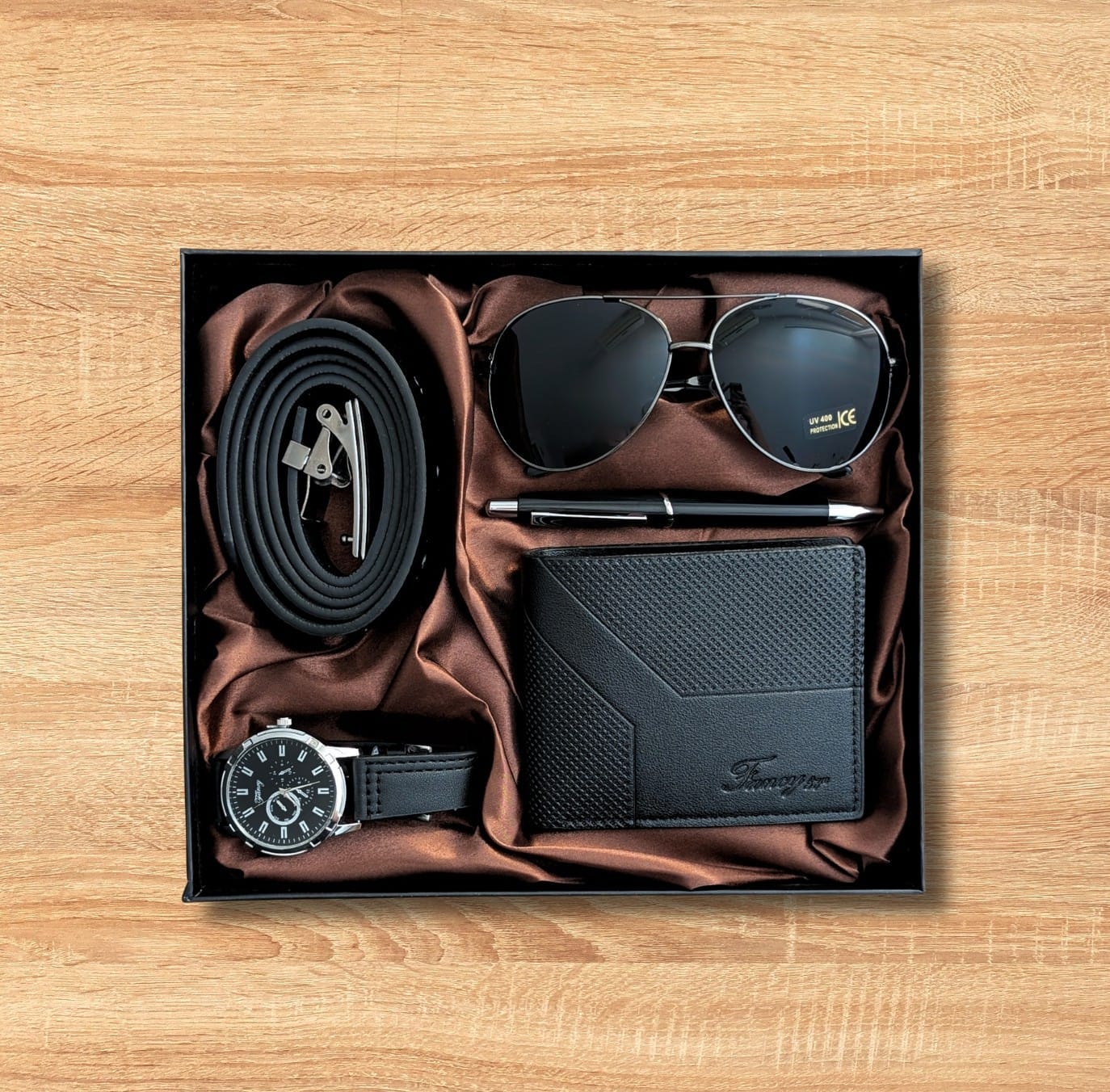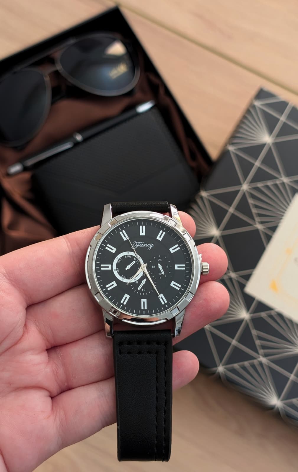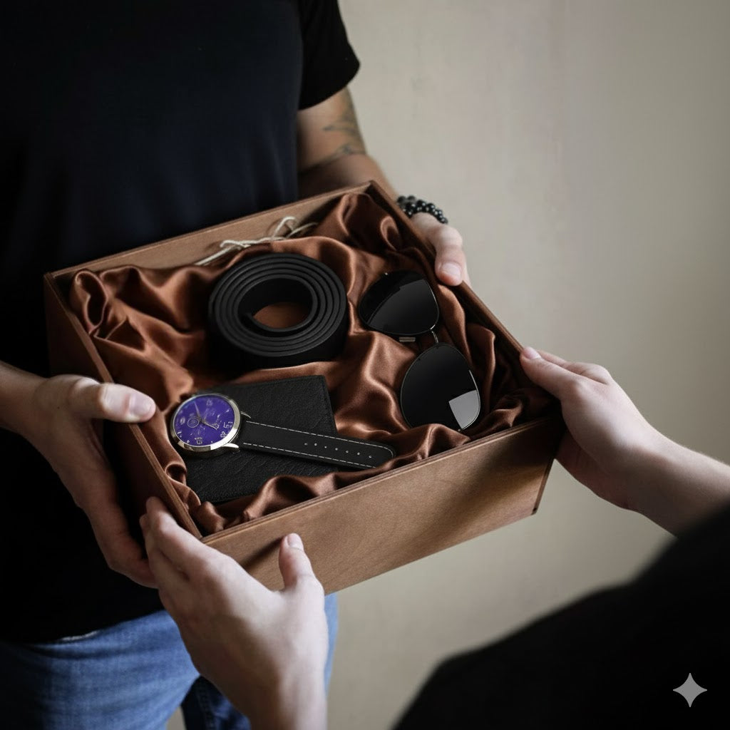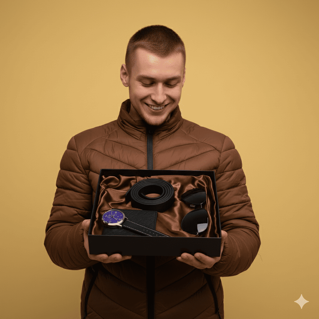 Za njega: klasičan, pouzdan i moderan set za muškarca koji zna šta želi. Sat koji govori bez reči, naočare koje odražavaju samouverenost, kaiš izrađen sa stilom, novčanik od fine teksture i dizajna koji traje. Sve zajedno čini poklon koji se ne zaboravlja i koji ostavlja utisak od prvog trenutka.