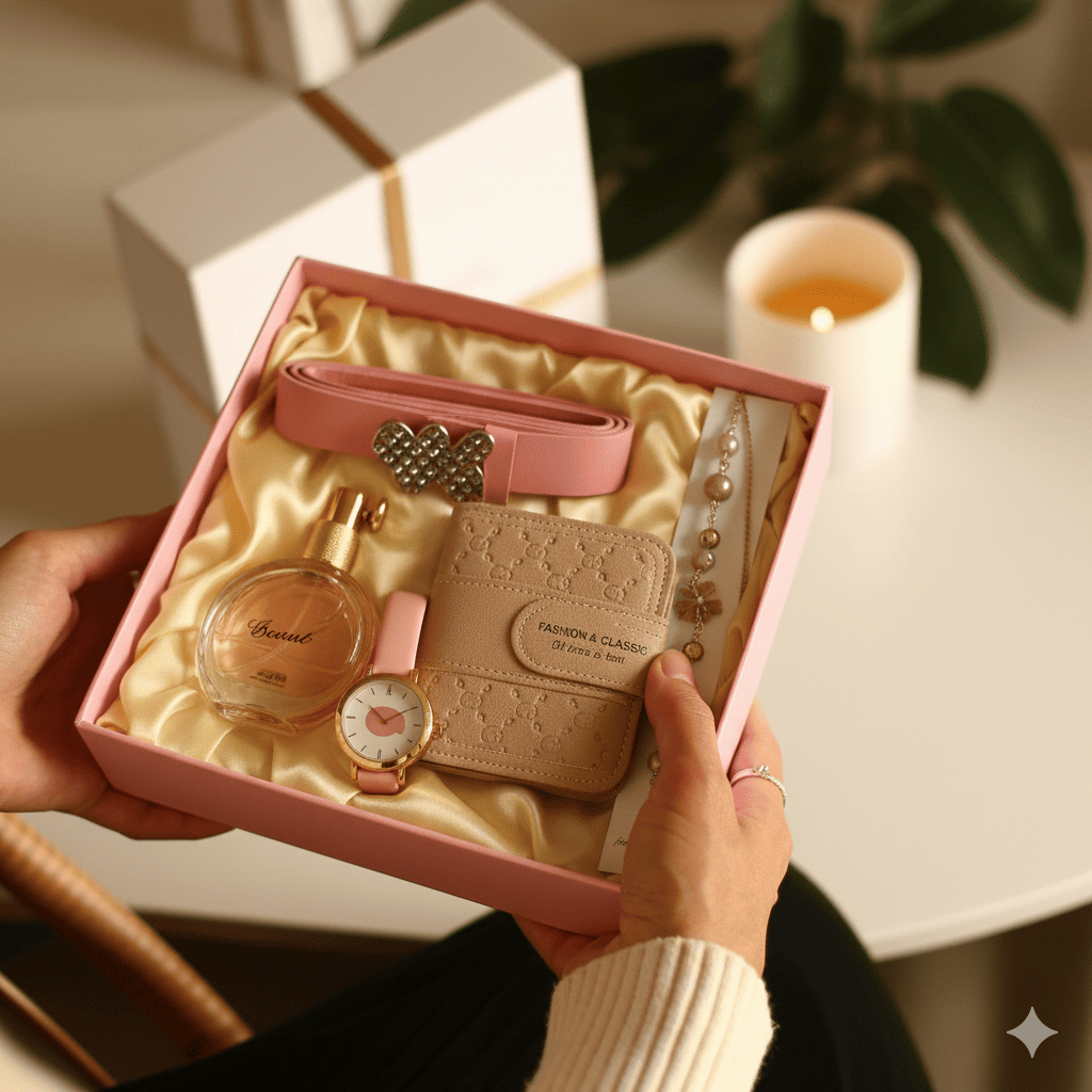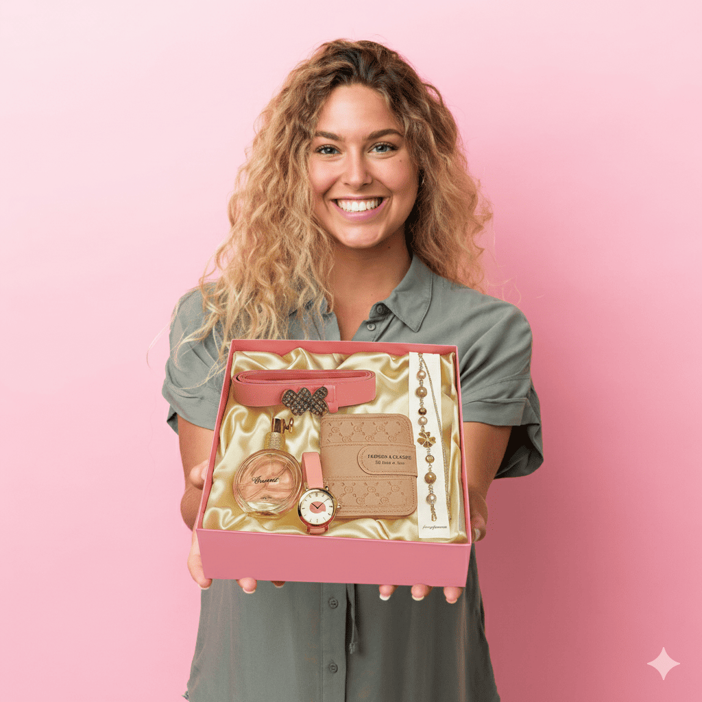 Parfem sa blagim, romantičnim notama, sat koji odiše elegancijom, kaiš sa sjajem i detaljima koji privlače pažnju, novčanik koji spaja praktičnost i prefinjenost, narukvica koja simbolizuje suptilnost i ženstvenost.