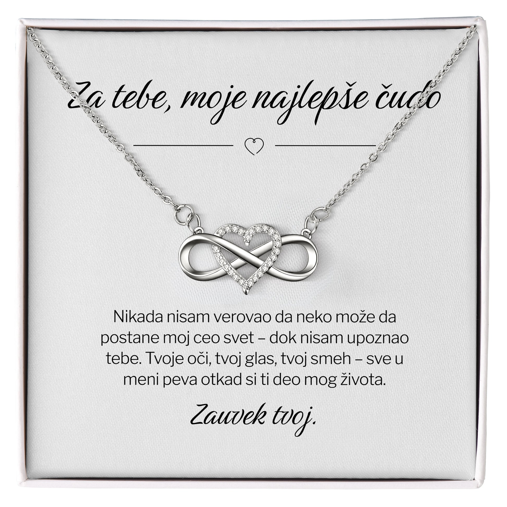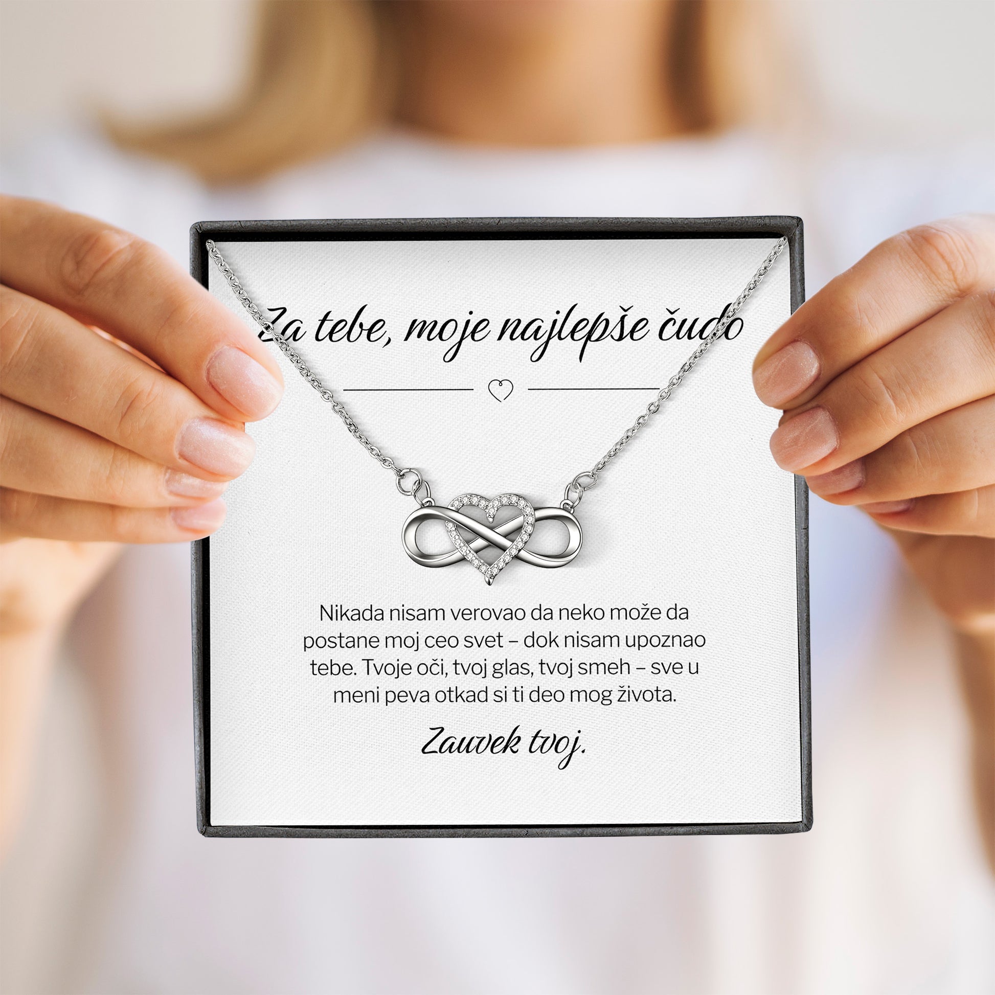 Predivna ogrlica "Infiniti srce" kombinuje simbol beskonačnosti sa oblikom srca, predstavljajući neprekidnu ljubav i povezanost. Ukrašena cirkonskim kristalima i izrađena od visokokvalitetnog nerđajućeg čelika, ovaj komad nakita je savršen za svaku priliku. Ogrlica dolazi u luksuznoj kutiji, uz posebnu posvetu koja dodaje još veću emotivnu vrednost ovom poklonu.